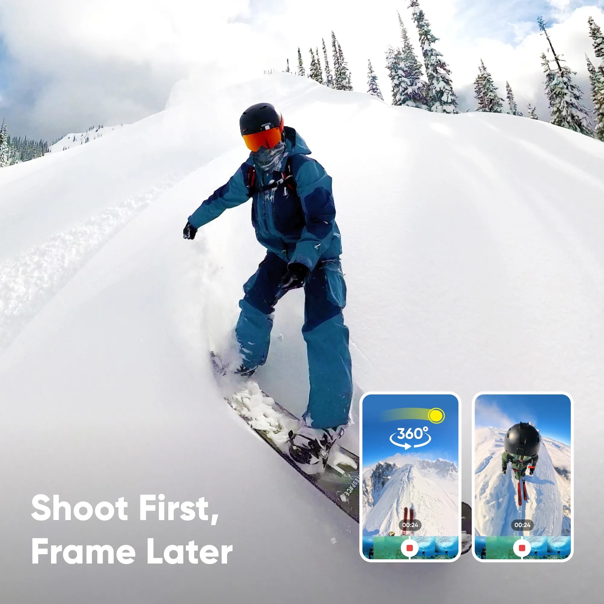 Snowboard Bundle includes 1x Insta360 X4, 1x Standard Lens Guards, 1x Action Invisible Selfie Stick and 1x Lens Cap.