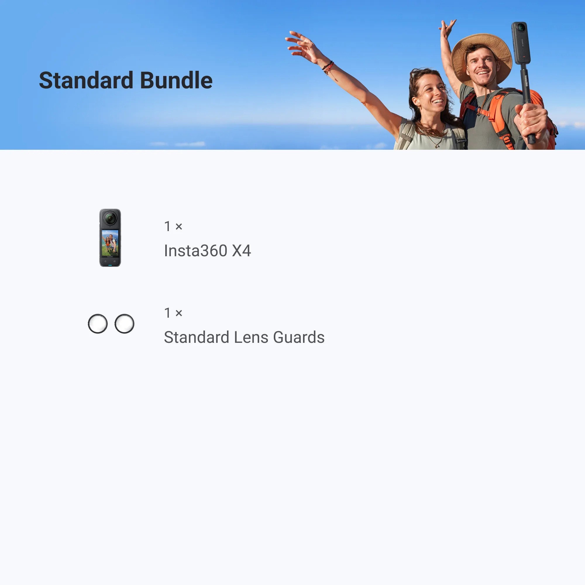 Standard Bundle includes 1x Insta360 X4 and 1x Standard Lens Guards, does not include microSD card.