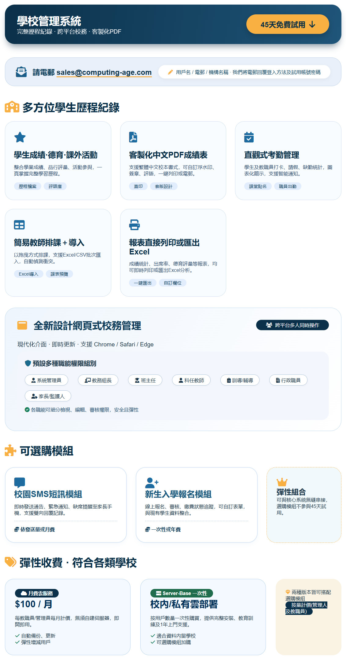 每教職員/管理員每月計價,無須自建伺服器,即開即用。