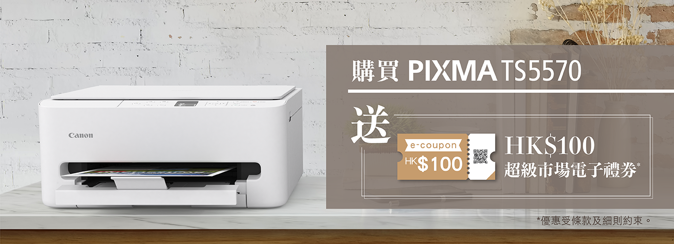 由即日起至 2026 年 2 月 28 日購買 PIXMA TS5570,即可免費獲贈 HK$100 超市禮券。