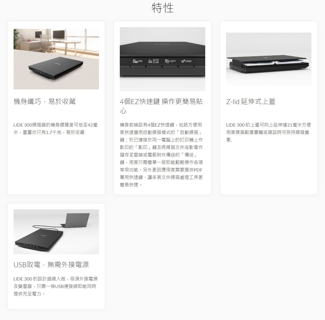 CanoScan LiDE 300 超薄平台式掃描器,運用佳能獨有的LiDE技術,令LiDE 300 機身僅厚42毫米,而且輕巧耐用。